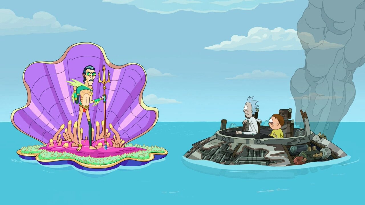 Ужин при свете скандалов. Морти, спасая горящего деда, валит корабль в океан — и этим будит старую войну: из воды выплывает мистер Нимбус, «король морей» и давний враг Рика, требующий переговоров… за столом у Смитов. Пока Саммер по тайному поручению ныряет за реликвией, Морти пытается совместить свидание с Джессикой и дипломатический цирк: Рик велит «быстро состарить» вино в портале-накопителе времени. Но за дверцей — свой Наруния-ад: добродушный Хуви, год за минуту, потом поколения, что растят ненависть к «мальчику из дыры». Каждое возвращение Морти — новая эпоха, новые ловушки, и однажды эту цивилизацию уносит фанатизм. Джессику втягивает в их временной омут, и лишь вмешательство Нимбуса выдёргивает всех обратно. Казалось бы, мир — рукопожатием… но Саммер приносит морскую «раковину власти», и вода снова встаёт на дыбы: Нимбус избивает Рика и сдаёт полиции. А Морти остаётся с прозрением: зрелость не добыть ярлыком будущего — её платят последствиями.