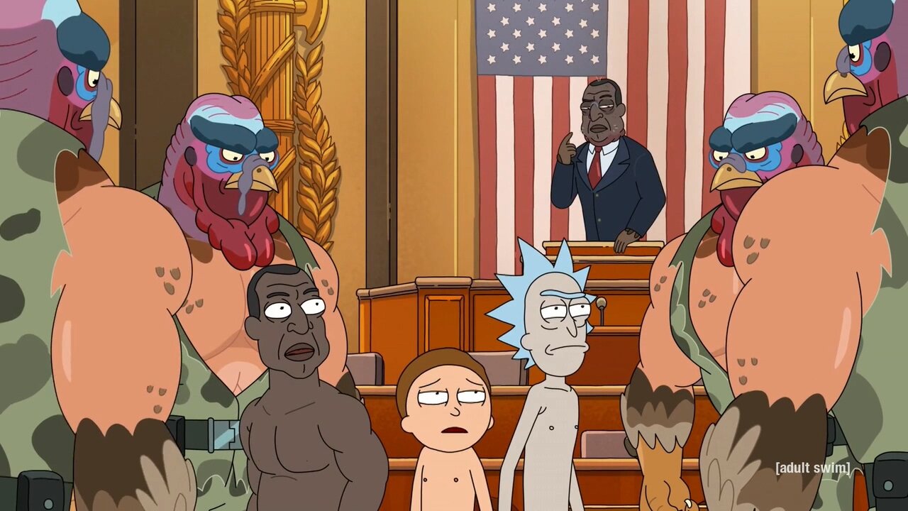 День благодарения у Смитов превращается в фейерверк мелких войн и больших обид. Рик с Морти лезут в охраняемый зал ради «карты-клада» в самой Конституции — один неверный рез лазера, и в пыль летят стекло, реликвия, Линкольн-мемориал и Liberty Bell; из статуи Свободы, к слову, выскакивает паровая машина-убийца, будто из французского кошмара. Президент объявляет дуэту домашний арест, но старый ритуал даёт новый шанс: ежегодное помилование индюков. Рик, верный изощрённым схемам, маскируется под птицу, президент отвечает военной операцией против «индюка-Рика», а дальше — снежный ком: гибридные солдаты «человек-индюк», биатлон из паранойи и эго, и древние «праздничные» мифы, внезапно вписанные в космическую историю Америки. Погоня по каналам власти сменяется короткой «перемирной» улыбкой — и тут же срывается, ведь их вражда держится не на поводах, а на характере. Праздник кончается, а перья ещё долго летят в вентилятор.